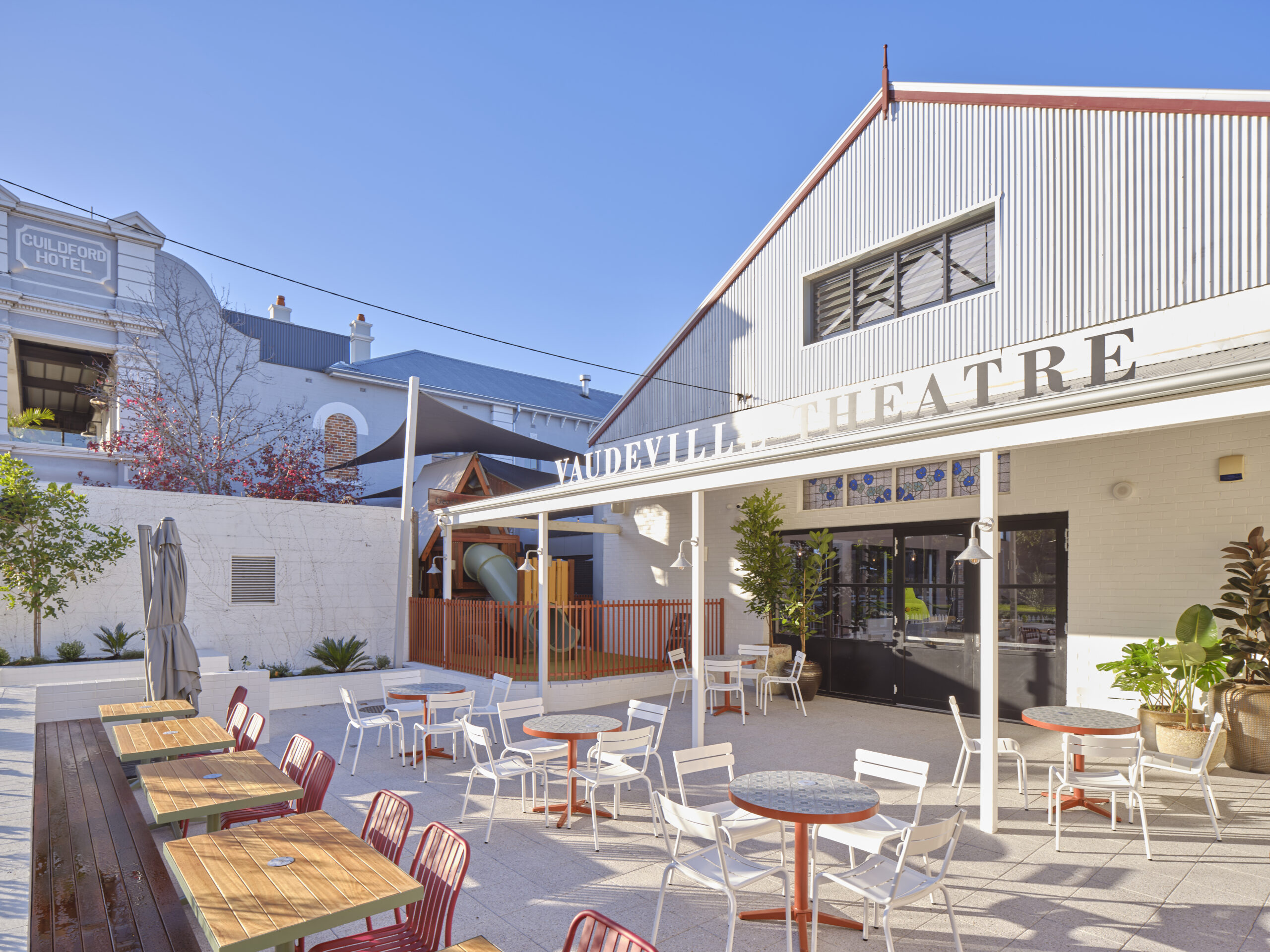 The Hall is the perfect spot for casual get togethers! Once the Vaudeville Theatre, this revitalised open plan space seamlessly integrates with the charming outdoor courtyard, beer garden and in sight of the new kids playground.